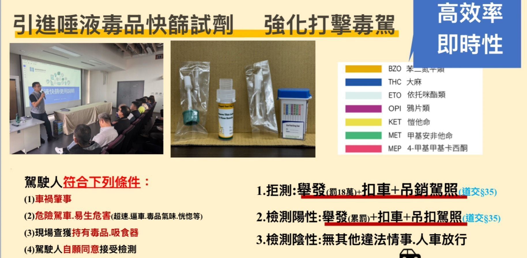 為積極打擊毒駕犯罪,本局於114年11月20日唾液毒品快篩檢測執法啟動首日,自辦「擴大取締酒駕、毒駕兼防制危險駕車勤務」,提供初篩試劑讓同仁用於勤務中,能迅速、準確、高效率判斷駕駛人有無毒駕情事,並依試劑呈陽性反應結果,當場開立罰單、車輛移置保管、吊扣其駕駛執照,有效遏止毒駕行為,維護民眾生命財產安全。