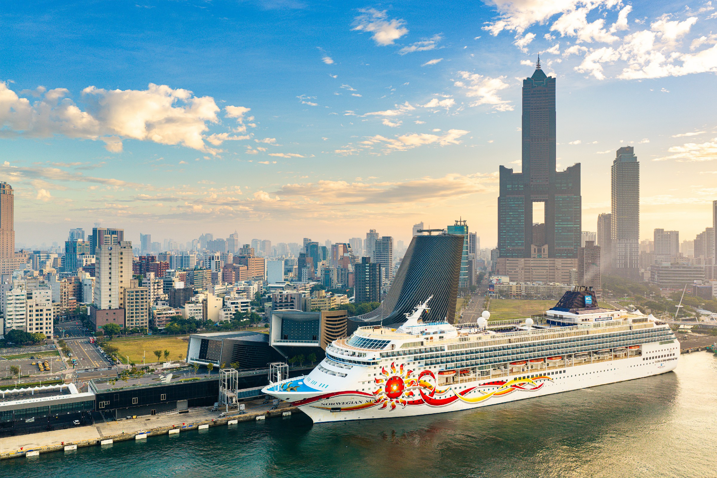 ↑圖說:挪威郵輪太陽號(Norwegian Sun)停靠高雄港旅運中心。(圖片來源:高雄港務分公司提供)