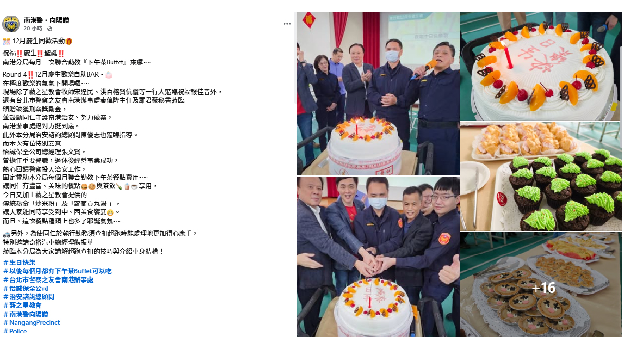 聖誕節腳步愈來愈近,由藝之星教會與台北市警察局南港分局共同發起的平安禱告大會日前溫馨登場。在牧師宋達民領唱聖歌下,平日辛勤執勤的波麗士大人難得放鬆心情,提前度過一個別具意義的聖誕節。