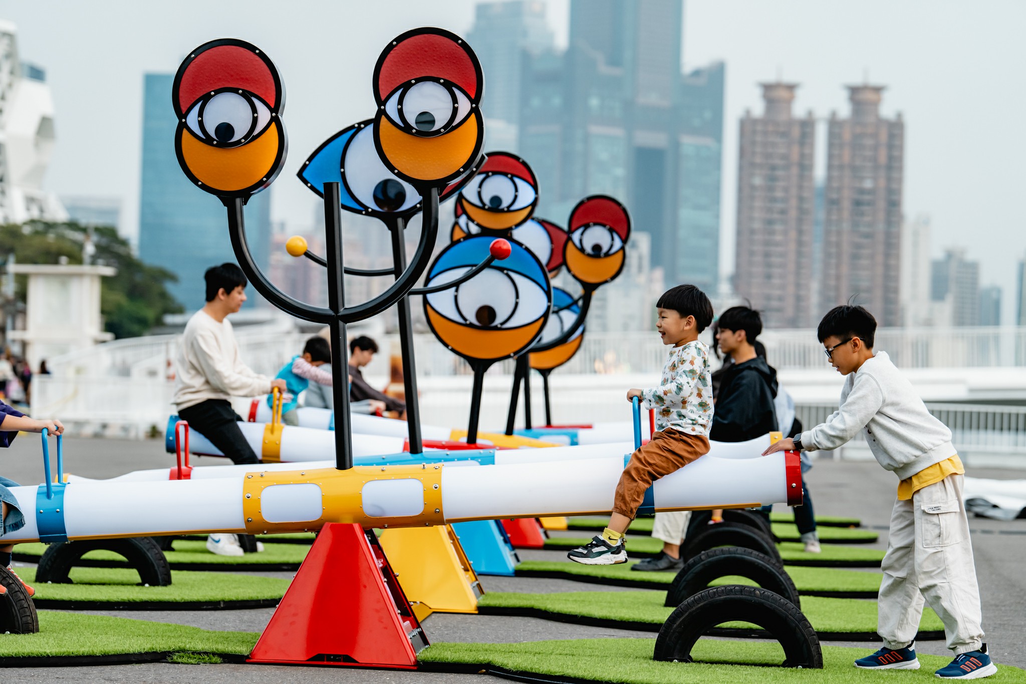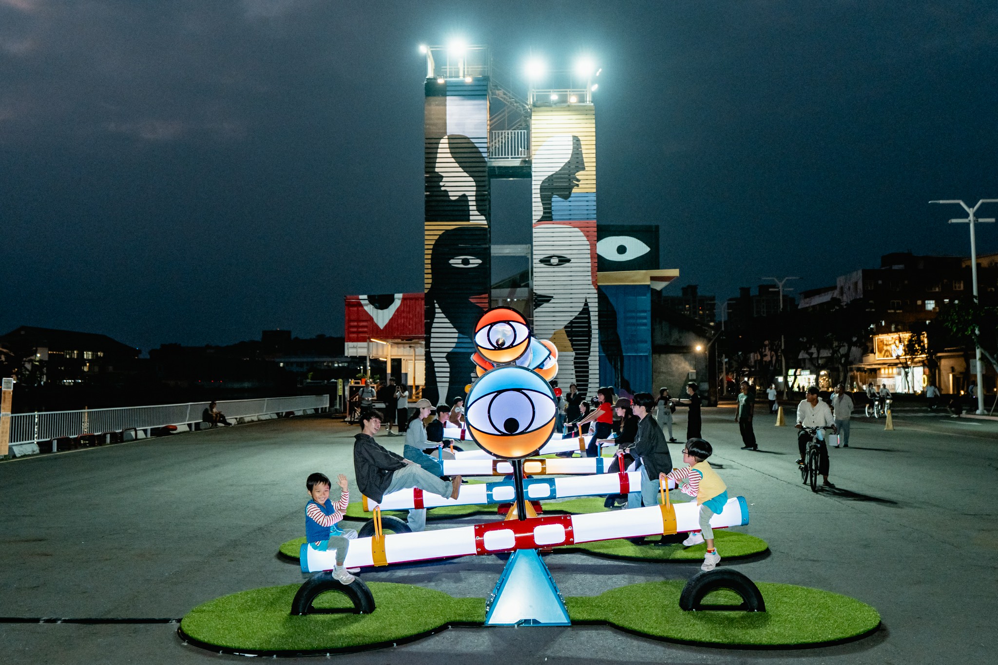 ↑圖說:《好奇翹翹板》共有6座互動式翹翹板,隨著遊玩觸發聲光效果,吸引大小朋友乘坐體驗。(圖片來源:駁二藝術特區提供)