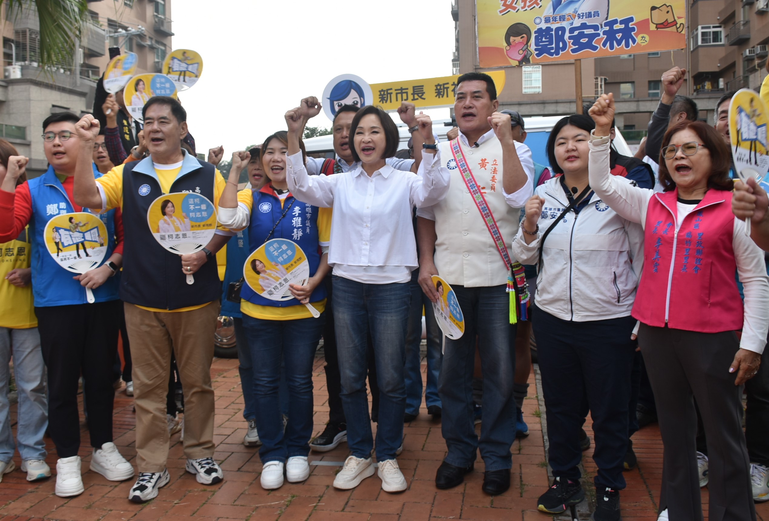 ↑圖說:柯志恩(中)帶頭高呼「九合一大選全壘打」。(圖片來源:記者 韓文明 拍攝)