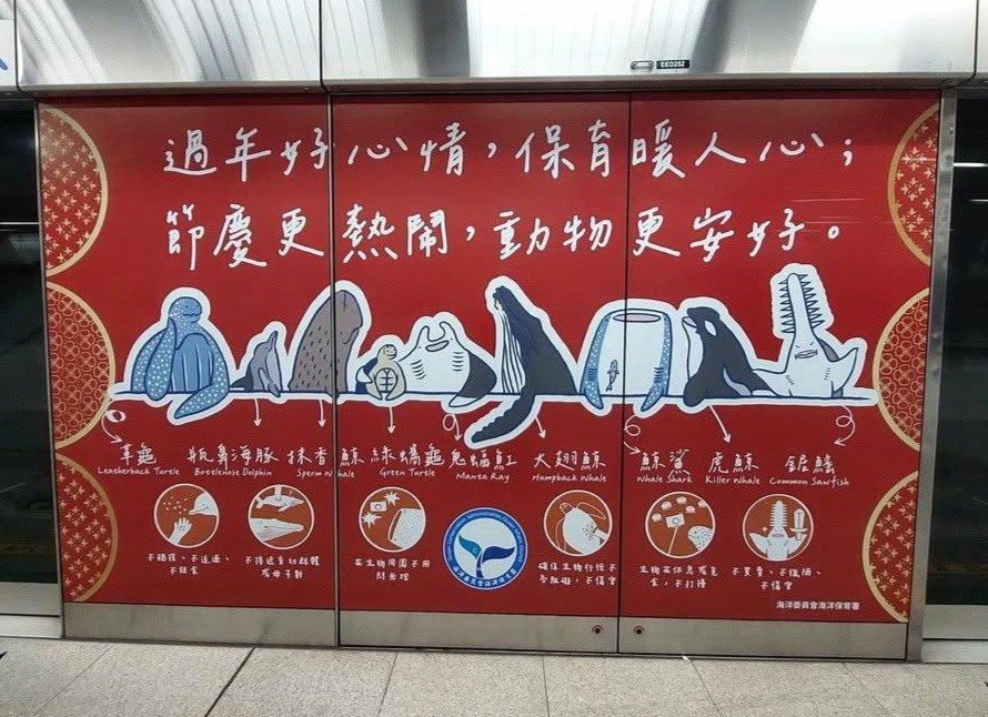 佳節歡慶之際也不忘守護海洋。為提升國人對海洋保育類動物的認識與關注,海洋委員會海洋保育署自聖誕節起至農曆春節期間,於高雄捷運美麗島站及左營高鐵站設置海洋保育宣導壁貼,以溫馨且充滿節慶氛圍的視覺設計,邀請往來旅客在過節同時,也能停下腳步關心海洋生態與珍貴的保育類海洋生物。