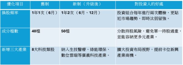 這次指數優化主要集中在頻率、檔數與產業範疇三個面向。首先是換股頻率由「一年一次」改為「一年兩次」,其次,成分股檔數由40檔擴充至50檔。最後則是納入新興潛力產業。