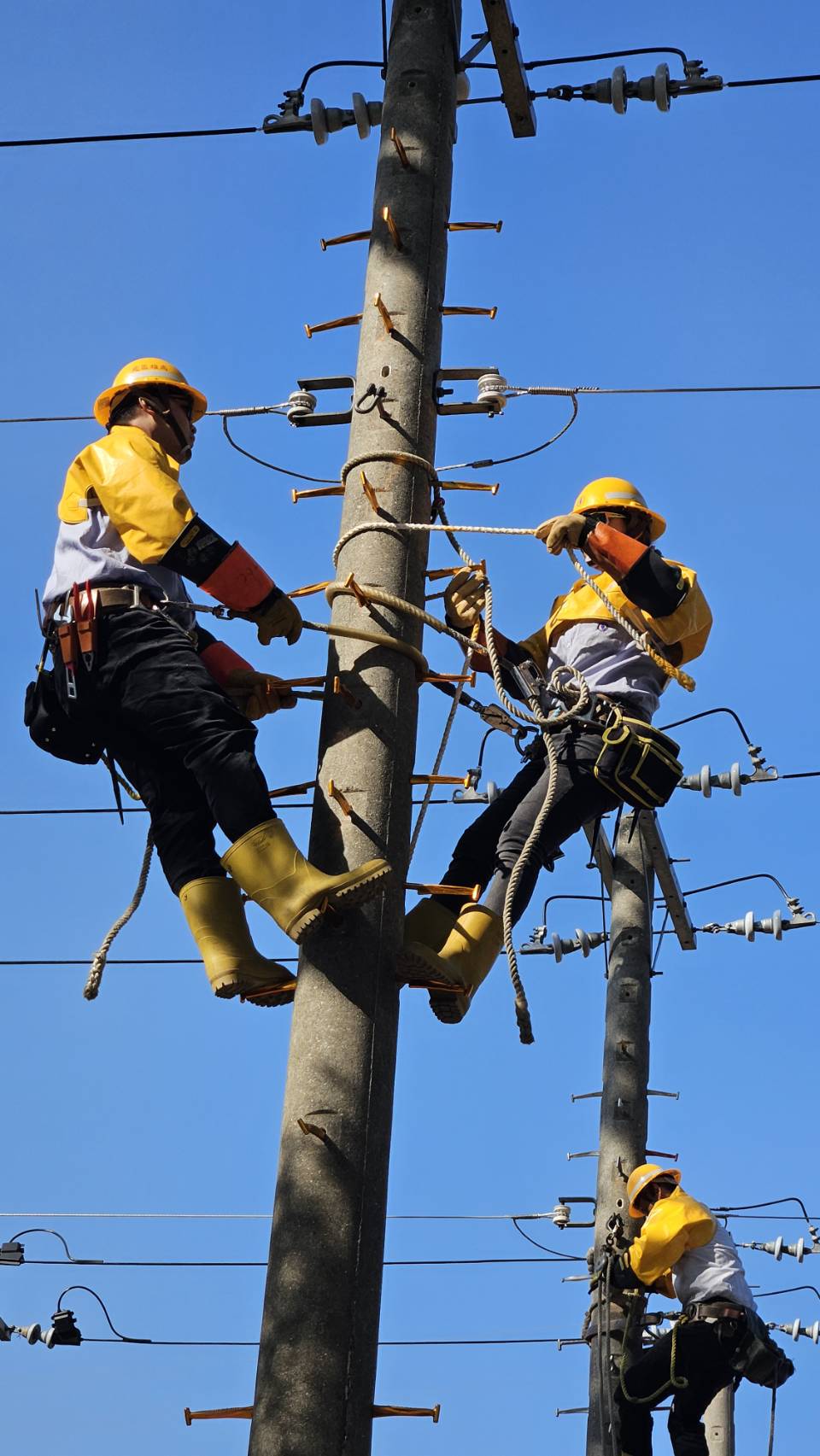 ↑圖說:配電外線團體組參賽者需身穿重達11公斤的裝備,攀爬9公尺高電桿,與隊友共同完成近2小時的搶修模擬。(圖片來源:記者 賴君欣 拍攝)
