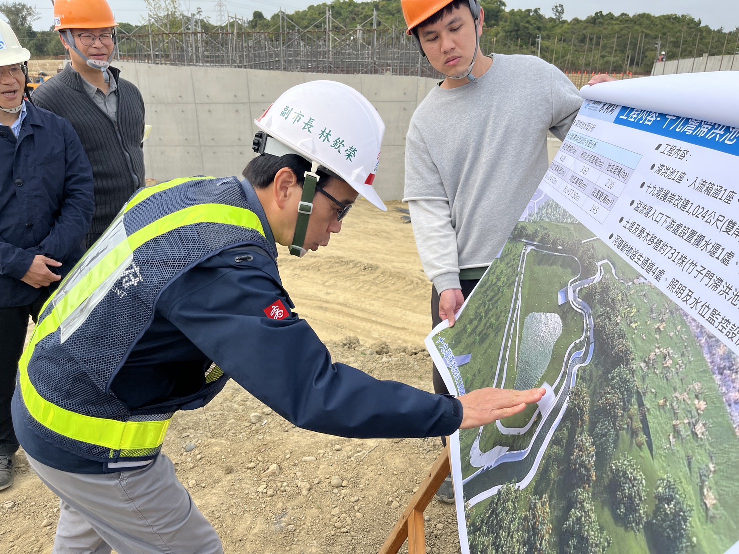 ↑圖說:林欽榮副市長視察鳥松區十九灣滯洪池,期許施工團隊能在非汛期間全力趕工,增加曹公新圳上游的滯洪功能。(圖片來源:高雄市水利局提供)