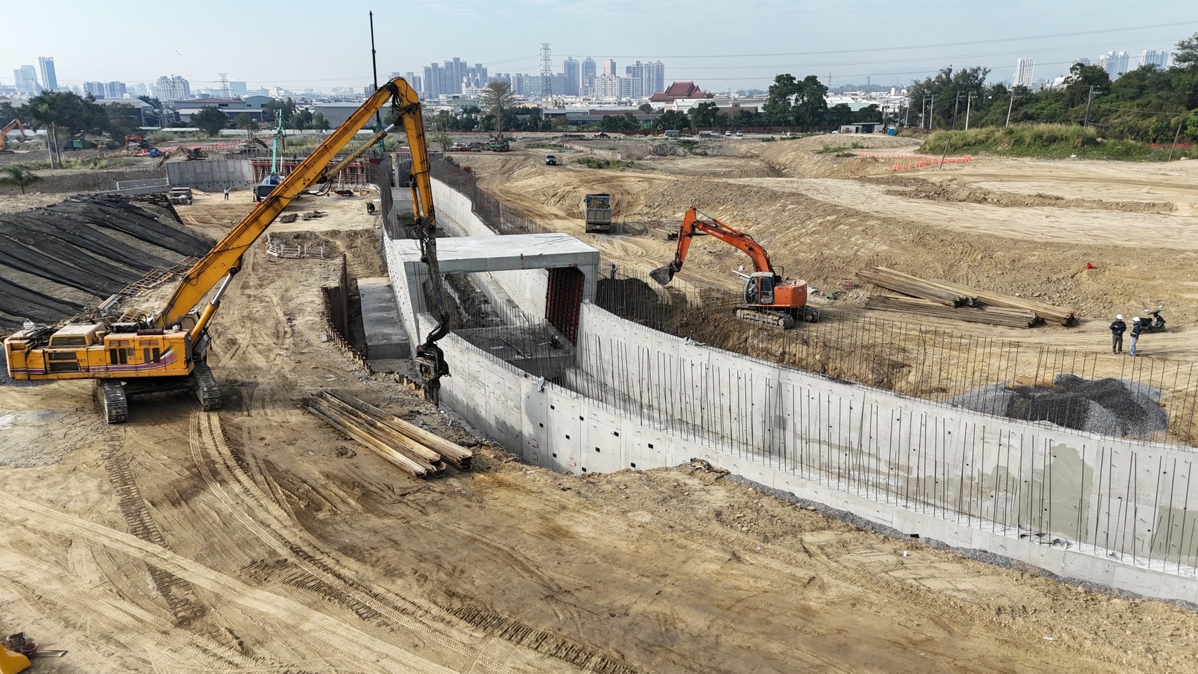 水利局表示,十九灣滯洪池占地約4.68公頃,設計滯洪量達19.5萬噸,工程經費由中央全額補助2億元,已於114年7月4日開工,預計於115年12月前完工。目前施工重點包括排水護岸、箱涵等設施,滯洪池主體亦已完成開挖施作。整體工程預定進度為40.7%,實際進度已達46.09%,超前5.39%,市府正積極趕工,力求在今年汛期前先行發揮滯洪功能。