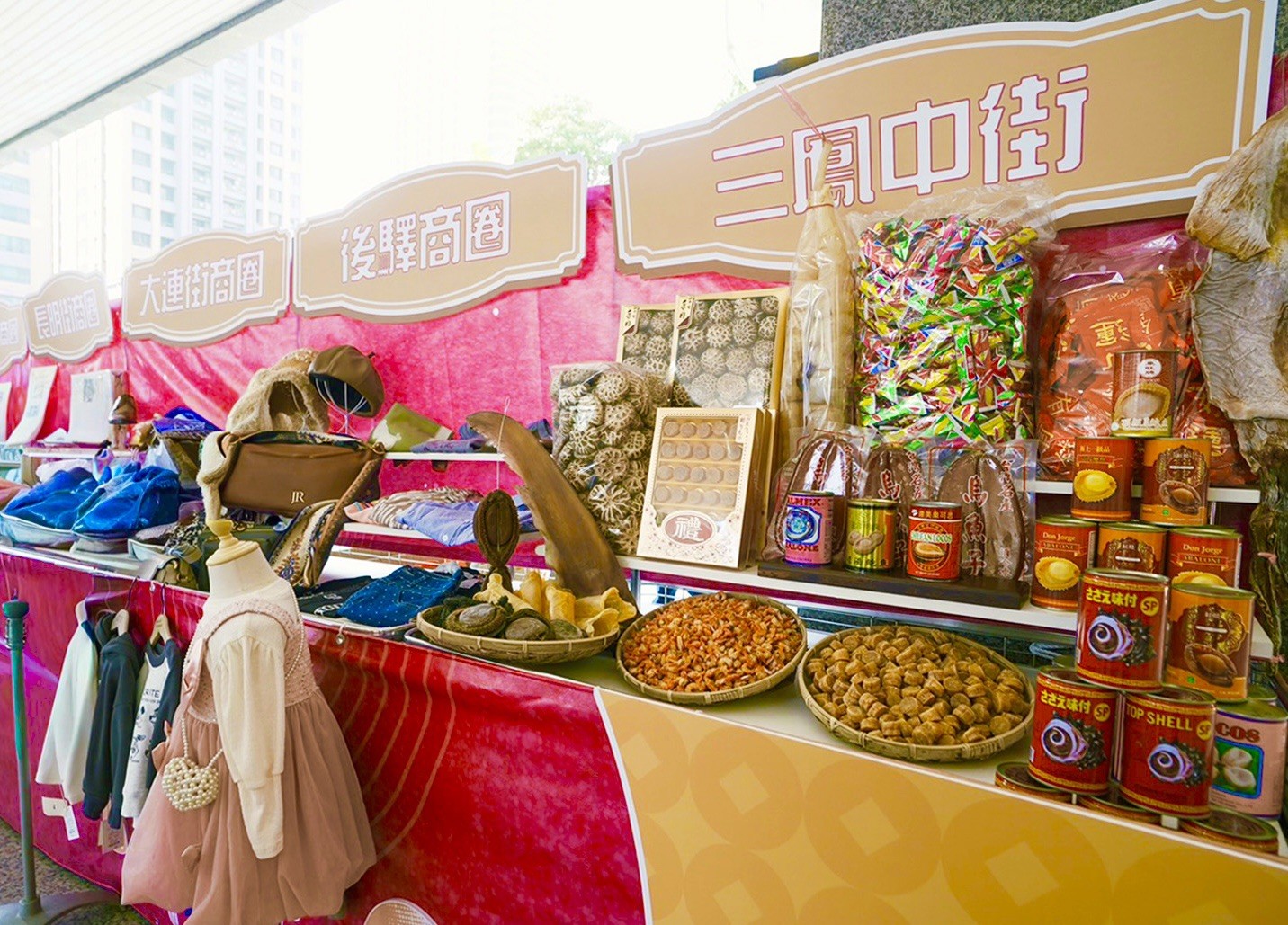圖說:高市府四維行政中心中庭展示各個商圈的特色物產與人氣商品。(圖片來源:高雄市經發局)