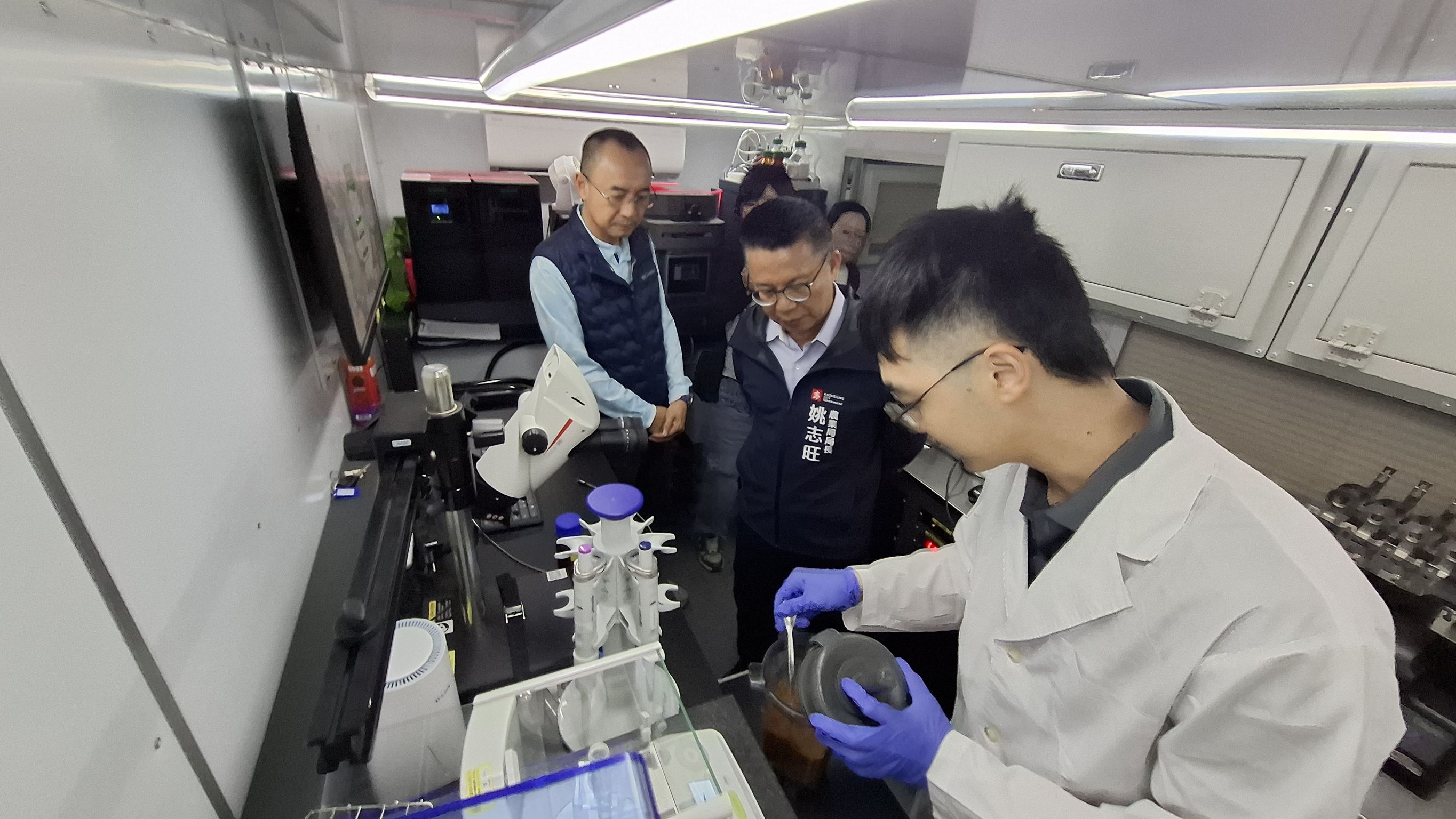 ↑圖說:農業局長姚志旺與梓官區農會總幹事林逸昌視察行動質譜車檢驗流程,行動質譜車可提供免費且速度快、準確度高的農藥殘留檢驗服務,協助農友即時掌握自家農產品安全狀況,守護食品安全(圖片來源:高雄市農業局提供)
