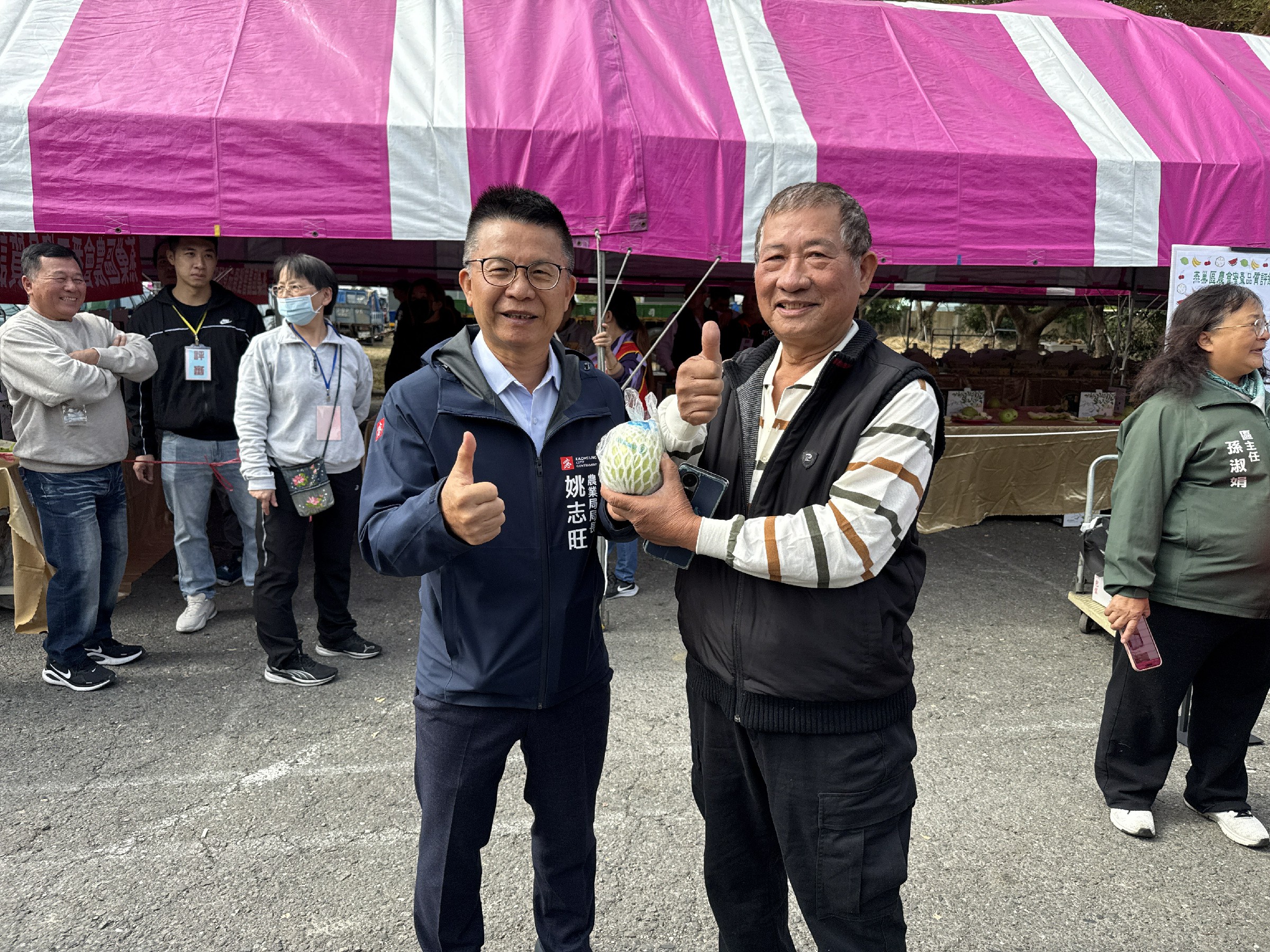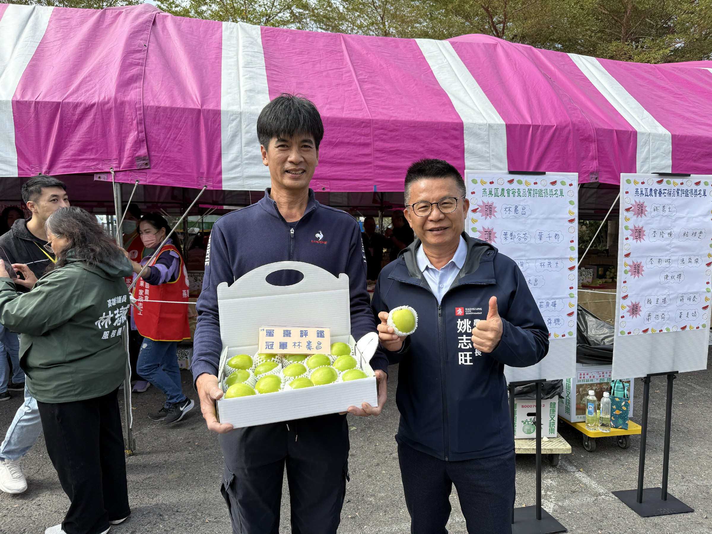 ↑圖說:高雄市政府農業局長姚志旺(左)與芭樂棗冠軍謝萬生農友(右)。(圖片來源:高雄市農業局提供)
