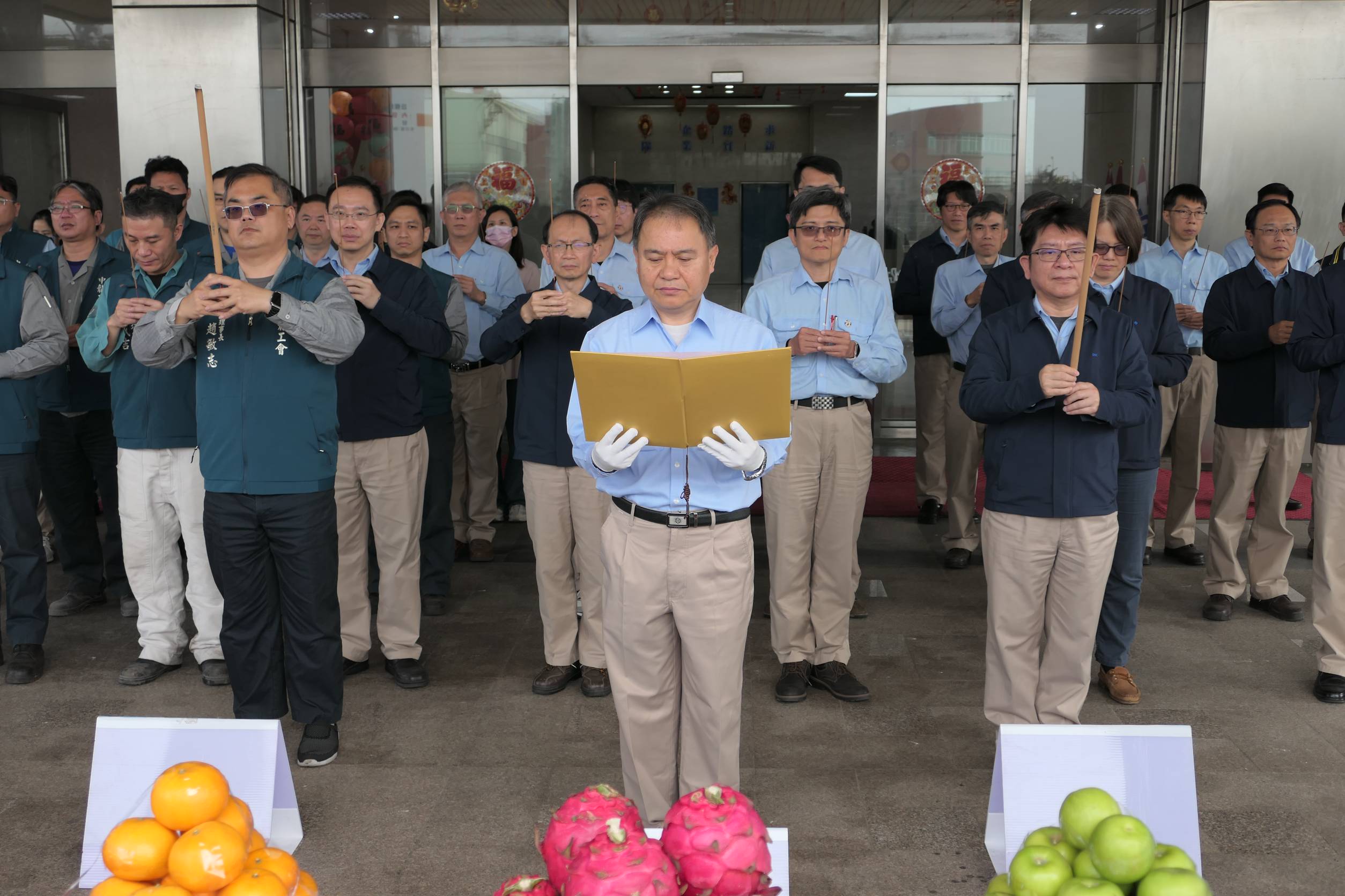 中龍鋼鐵2/24日舉辦115年新春開泰祈福典禮,由總經理梁乃文擔任主典官,生產部門副總經理洪正雄以及中龍企業工會理事長趙敏志擔任陪典官,與公司經理部門、各單位主管及工會理監事等焚香祈福,祈求馬年營運昌隆、平安順遂。