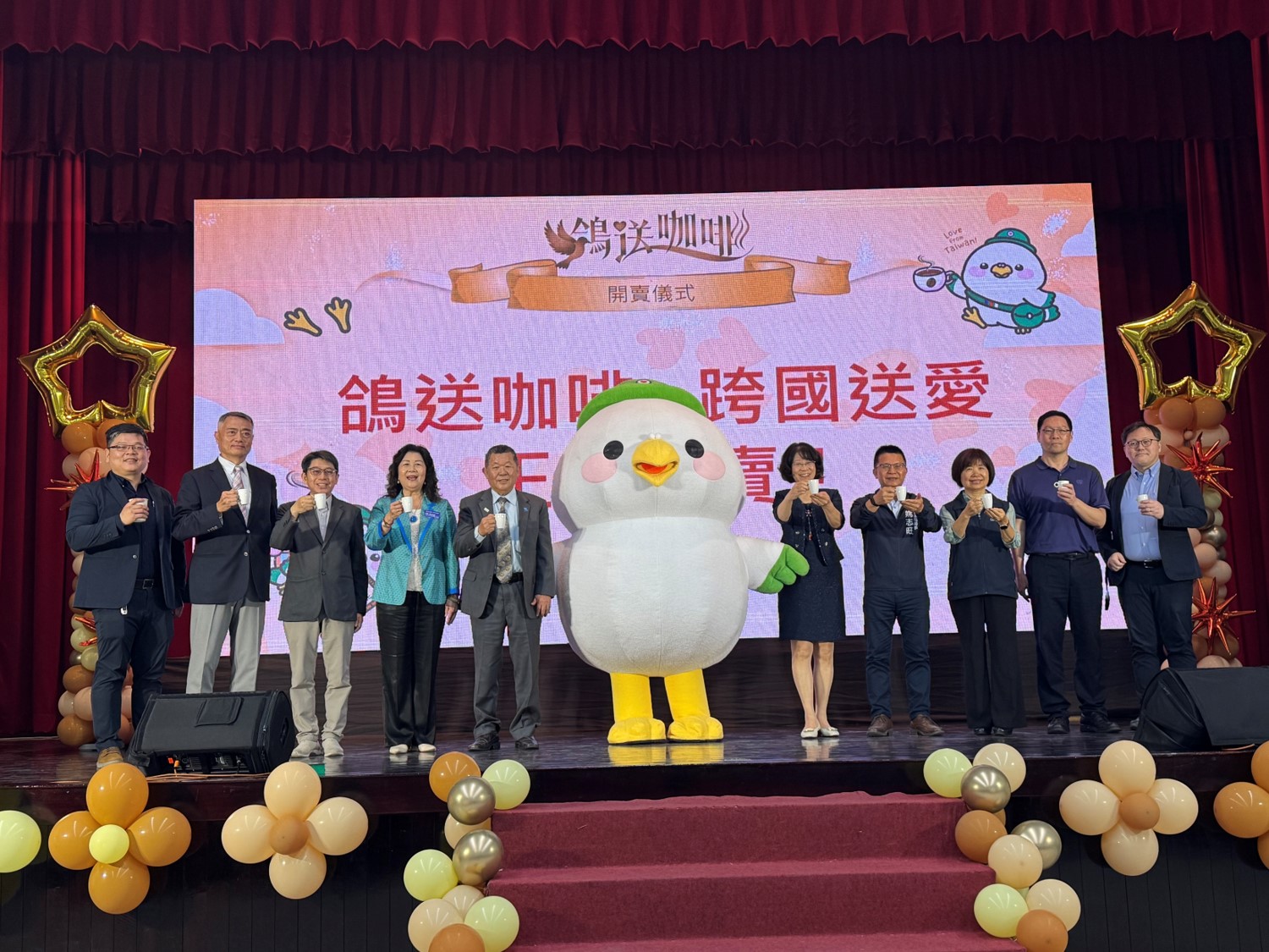 圖說:高雄郵局局長尤素珍(右五)與馬拉威台商施鴻森(左五)合作「鴿送咖啡跨國送愛」產品發表會,獲得企業界響應。(圖片來源/林秀美攝影)