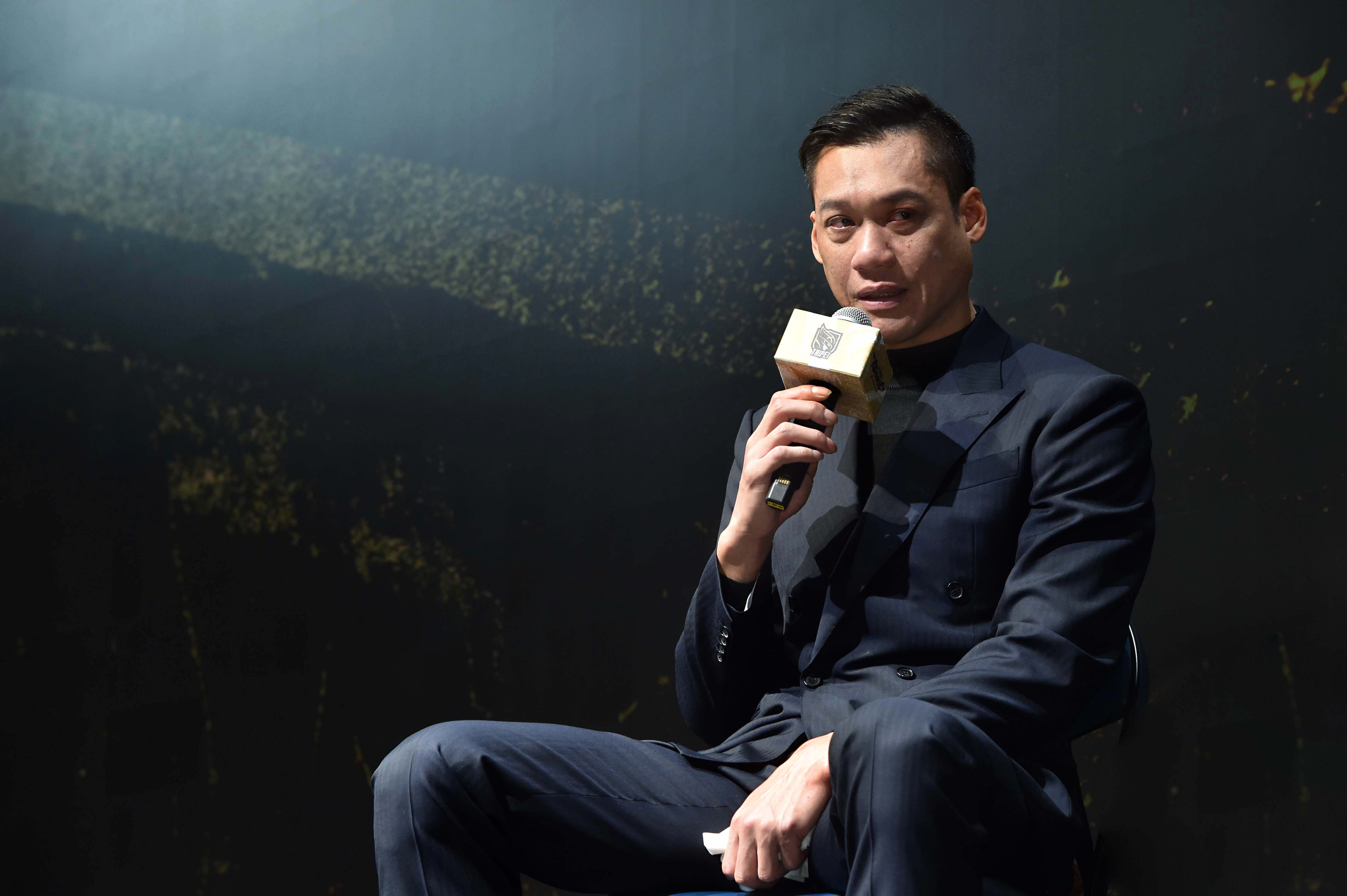 記者會上提及家人時,林志傑一度激動落淚、久久無法言語(如下圖,台灣大提供),表示想把心裡最深的感謝與告別,留到引退賽當天再說。