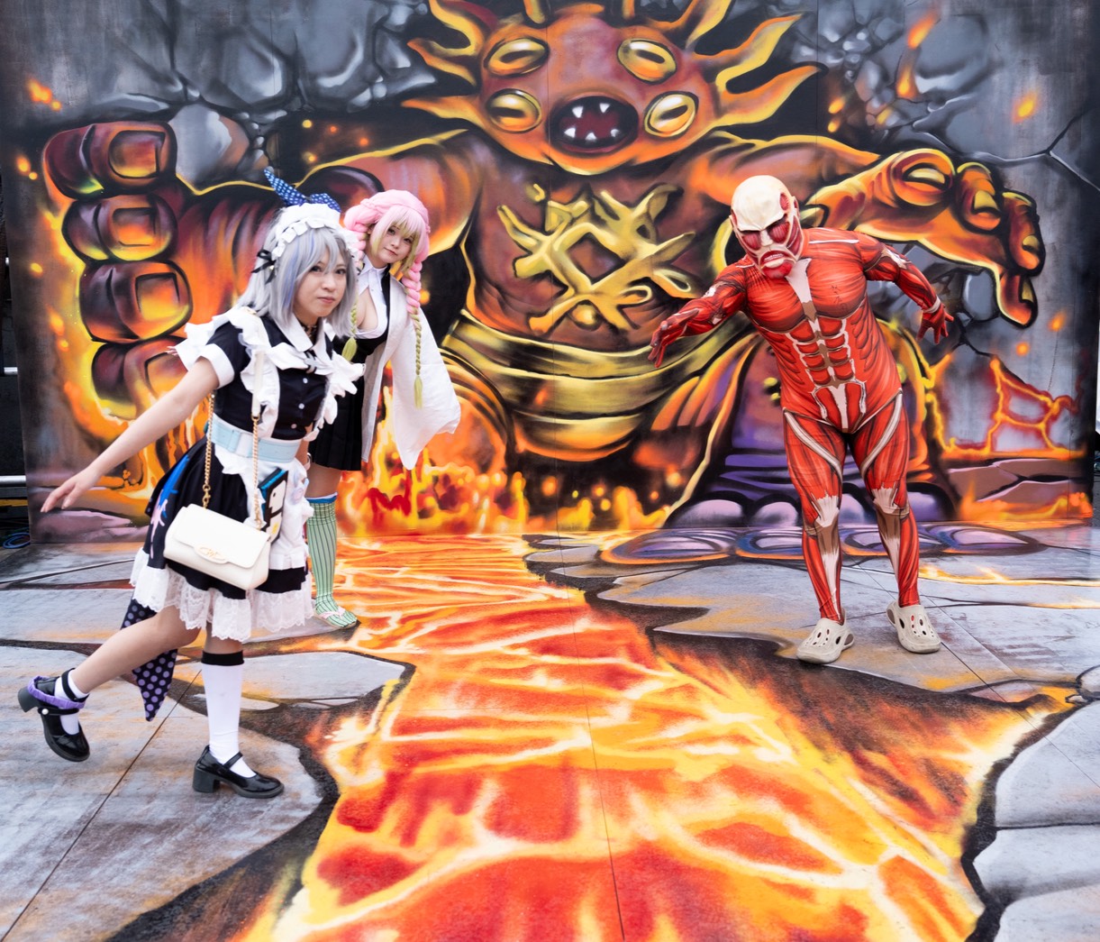 ↑圖說:現場裝扮精緻的Cosplayer於青年塗鴉藝術家「培特豬」傾力繪製的3D打卡牆前合影,與「大港青年防衛隊」主題相互呼應,成為活動熱門拍照亮點。(圖片來源:高雄市青年局提供)