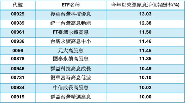 高股息ETF今年以來績效前十名