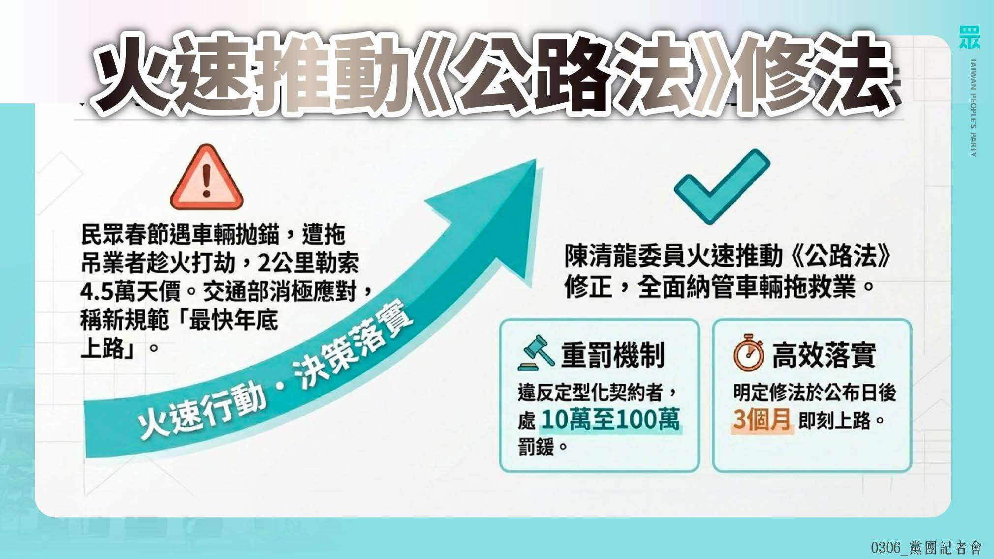 台灣民眾黨立法院黨團今(6)日召開記者會,針對民生亂象、國防預算及人事延宕案重砲轟擊民進黨政府,痛批行政院消極不作為。黨團指出,近日發生民眾春節車輛拋錨,遭不肖業者2公里勒索4.5萬天價之「拖吊蟑螂」事件,交通部卻稱新規範最快年底才上路,效率令人咋舌。對此,民眾黨團陳清龍委員已火速推動《公路法》修法,要求全面納管車輛拖救業,並明定違反定型化契約者處10萬至100萬元罰鍰,力求修法公布後3個月內即刻上路,守護民生權益。