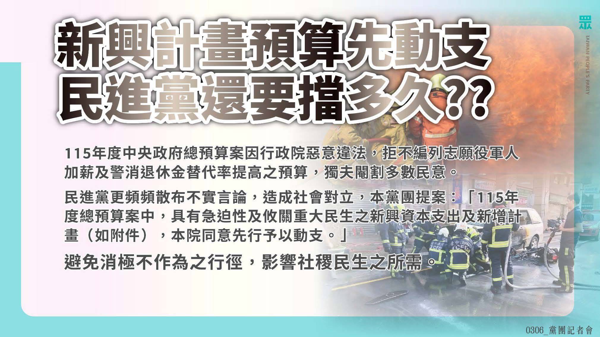 此外,對於115年度總預算因行政院拒編志願役加薪及警消退休金預算而卡關,民眾黨團亦提案同意先行動支具急迫性的新興資本支出及民生計畫,避免政黨惡鬥影響社稷。針對中選會人事案,黨團也詳列時序表回擊抹黑,證實從去年8月起即積極督促提名,呼籲賴政府別再政務廢弛。