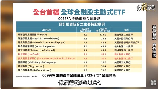 節目最後,阮慕驊為觀眾解答了如此誘人的全球金融股,台灣投資人該如何輕鬆上車的投資管道。即將在 3 月 23 日至 27 日展開募集的「00998A(主動復華金融股息 ETF)」,就是一檔能幫投資人一次打包歐洲與美國頂尖金融巨頭的投資利器。擺脫被動追蹤指數的限制,00998A 由經理人主動嚴選市值百億美元以上、低壞帳的歐美優質金融巨擘,並搭配具爆發力的 Fintech 科技股,精準掌握被市場低估的「轉機股」與「併購題材」,且因為配息屬於海外所得,還能享有 750 萬的免稅額度優勢。對於想在 AI 震盪行情中穩住資產,又想兼顧高股息與大價差的投資人,絕對是值得留意的全新選擇。