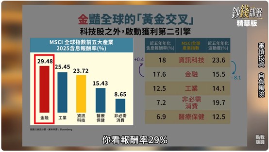 然而,節目中最令投資人驚豔的,莫過於「國際金融股」的超強爆發力。許多人以為 AI 科技股是報酬率霸主,但數據顯示,2025 年 MSCI 國際金融指數的含息報酬率高達將近 30%,甚至超越了資訊科技股。拉長至 5 年來看,金融股的報酬率不僅與科技股旗鼓相當,其波動率更是大幅減少了 8%,真正做到「高報酬、低波動」。