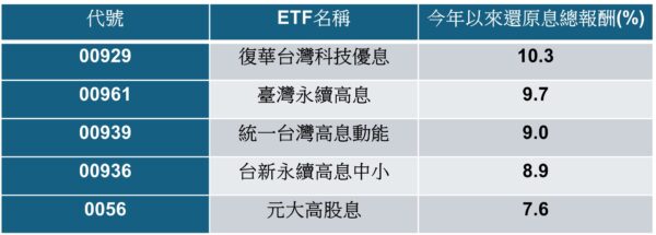 高股息ETF績效排名出爐!統計23檔高股息ETF今年以來表現,僅5檔含息報酬率超過7%,其中復華台灣科技優息(00929)以10.3%的還原息總報酬率居冠,且為唯一報酬突破一成的高股息ETF。同時,在近一週與近一月表現上,00929含息報酬也優於大盤及電子類股指數,表現亮眼。
