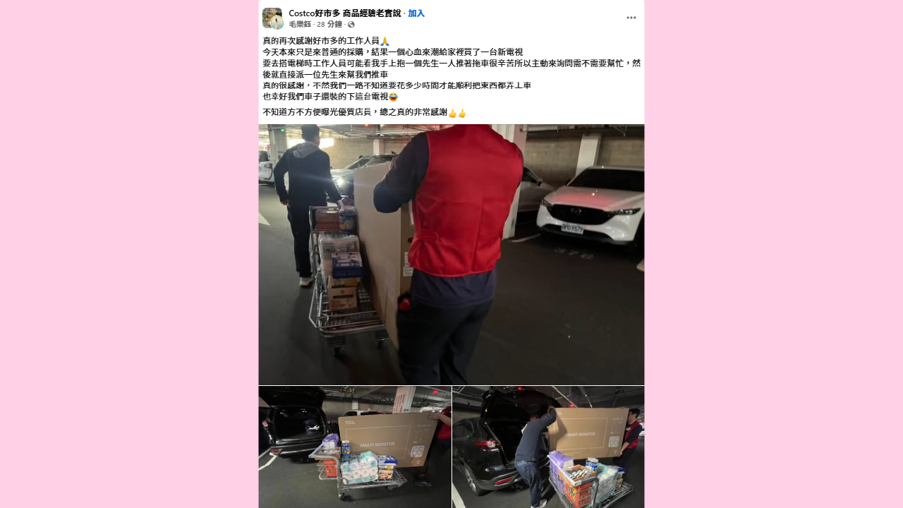 美式賣場好市多(Costco)以高CP值商品深受國人喜愛,而其「美式服務」也時常成為社群討論的焦點。近日一位民眾在臉書社團「FB-Costco好市多 商品經驗老實說」發文分享暖心經歷,表示原本只是單純採購,卻臨時起意買了一台大電視,正當與先生為了笨重貨物而顯得手忙腳亂時,賣場工作人員竟主動上前詢問是否需要幫忙,並直接指派一名店員協助推車,一路護送到停車場協助上車,讓該名網友直呼:「真的很感謝,不然不知道要花多少時間!」