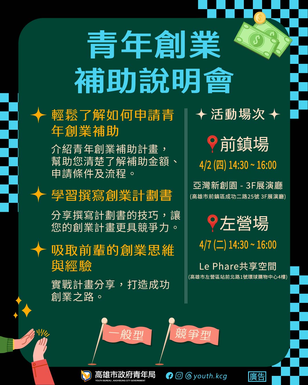 為協助申請者掌握補助重點與流程,青年局將於4月2日及4月7日舉辦說明會,分別於亞灣新創園及新左營站共享空間登場,除說明申請細節外,也邀請歷屆獲補助團隊分享創業經驗,提供有意申請者實務參考。