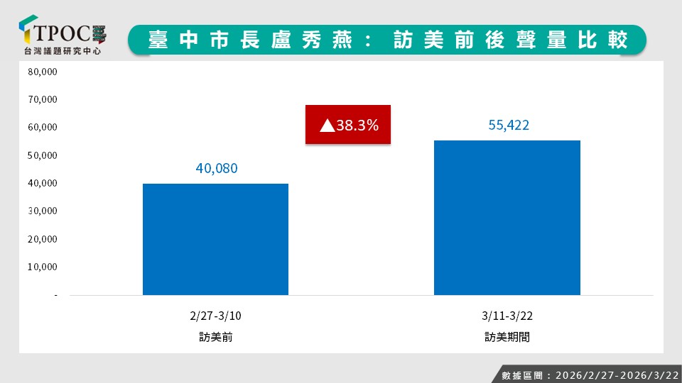 台中市長盧秀燕於3月21日結束訪美的相關行程,橫跨美國 5 州 9 區並獲高規格接待,成功拜會政要並為產業發聲。盧秀燕強調,此行圓滿鞏固台美情誼,並深化城市交流與投資合作。TPOC台灣議題研究中心統計盧秀燕訪美期間的聲量表現,則可以發現盧秀燕在訪美期間的總聲量為5萬5422筆,相較於訪美前的4萬80筆,整體聲量大幅上漲38.3%。