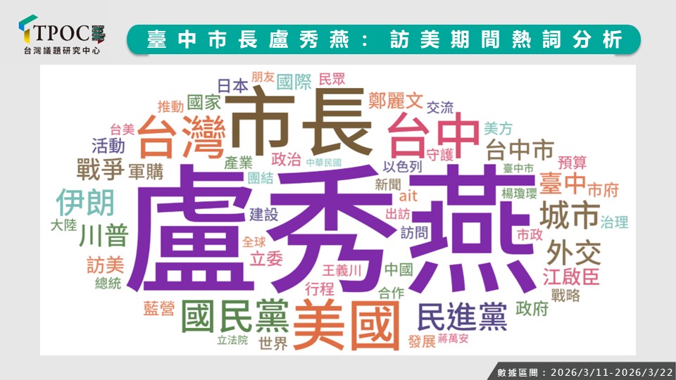 在伊朗、以色列等國際衝突加劇、全球局勢陷入動盪之際,盧秀燕此次訪美成功帶動了自身38.3% 的聲量增長,且討論核心高度集中於具備外交指標性的機構。這反映出在國際局勢動盪、伊以衝突升溫的背景下,大眾對台美實質溝通的關注度顯著提升。