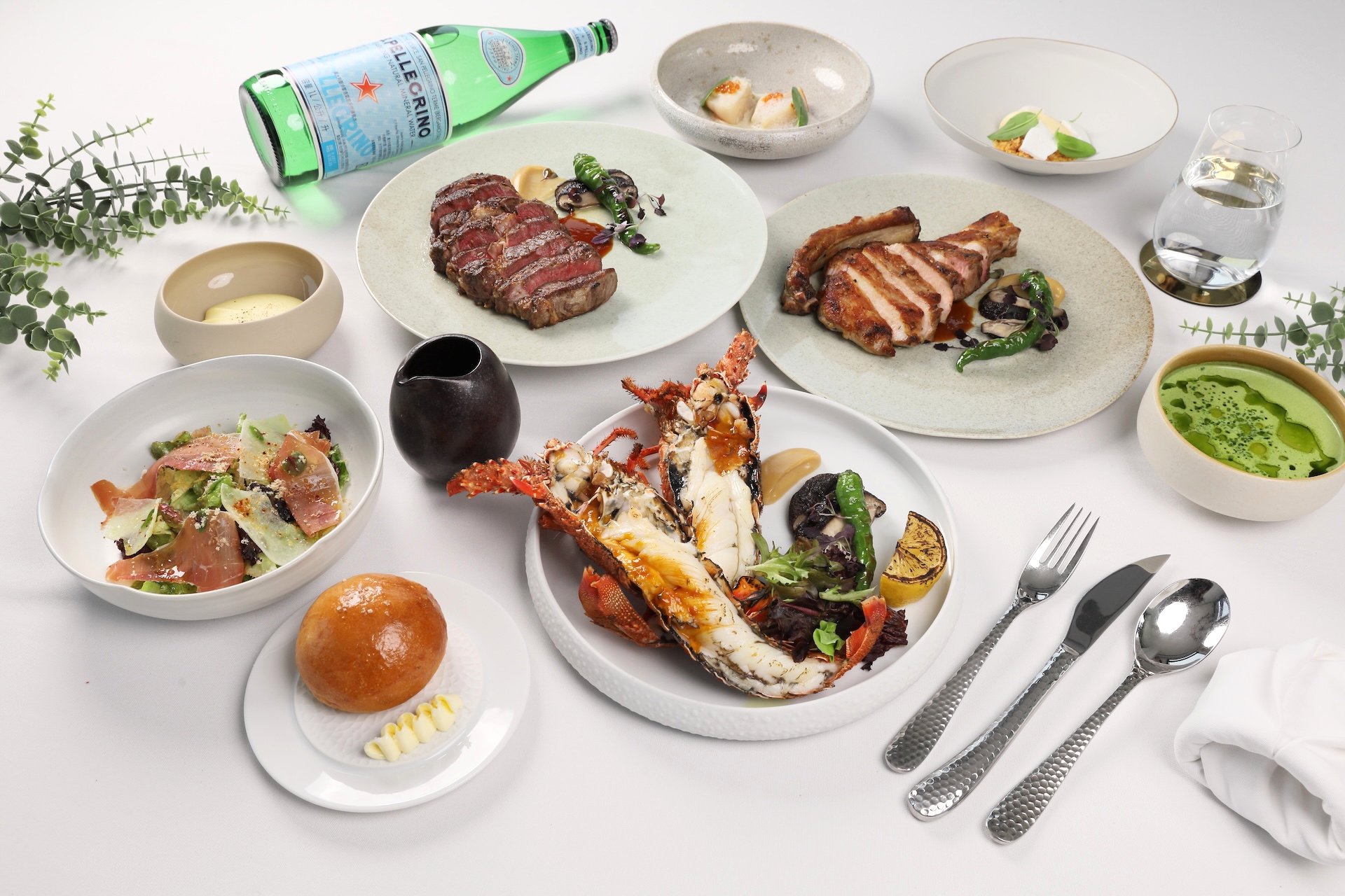 菜色規劃從前菜到主餐層層鋪陳,包括以鹹香平衡開場的西班牙塞拉諾風乾火腿沙拉、口感滑順的櫛瓜濃湯,以及香煎北海道干貝搭配白酒奶油醬與鮭魚卵等開胃料理。主餐部分則提供多達13款選擇,涵蓋美國頂級肋眼牛排、戰斧豬排與爐烤活龍蝦等,透過精準火候呈現食材最佳狀態,最後再以精緻甜點與飲品收尾,完整展現法式餐飲節奏。