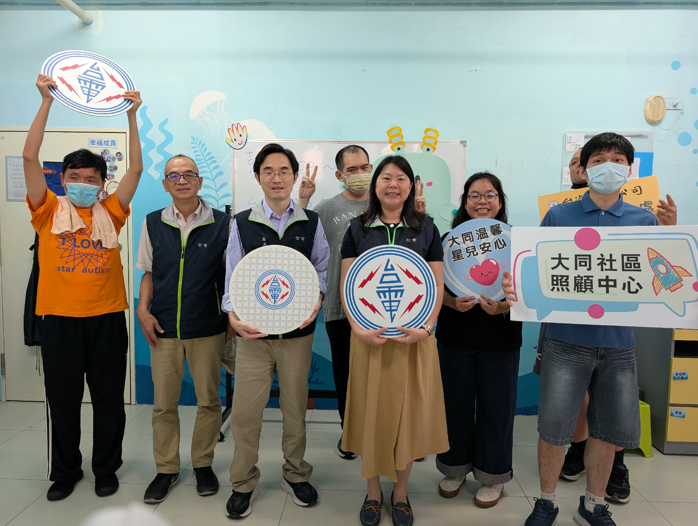 ↑圖說:台電高雄區處業務副處長許佳玉(中,持台電logo)率隊前往位於新興區的大同社區照顧中心,除致贈善款外,也與星兒一同參與手撕勞作體驗,透過實際互動傳遞關懷與陪伴。(圖片來源:台電高雄區處提供)