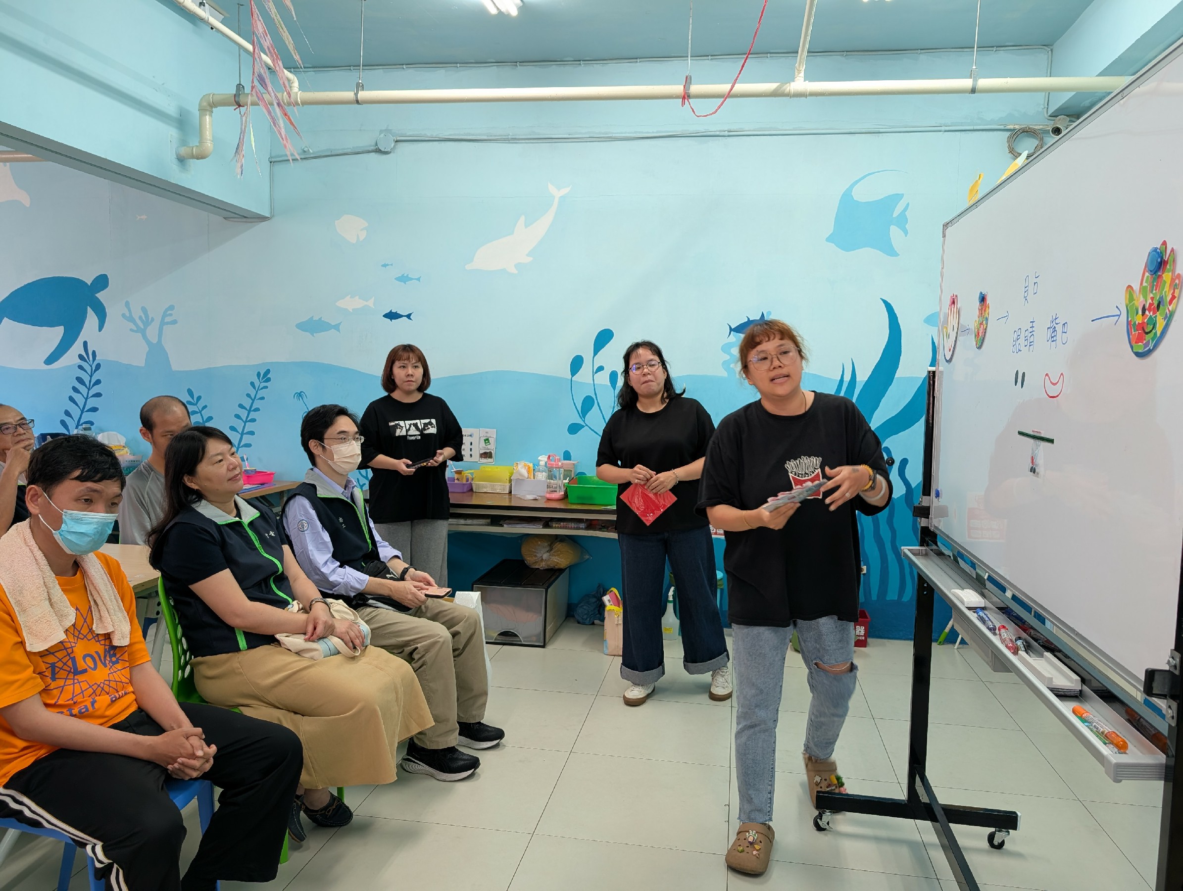 ↑圖說:台電高雄區處業務副處長許佳玉(左1)與照顧中心的星兒們一起做手掌撕貼創作。(圖片來源:台電高雄區處提供)