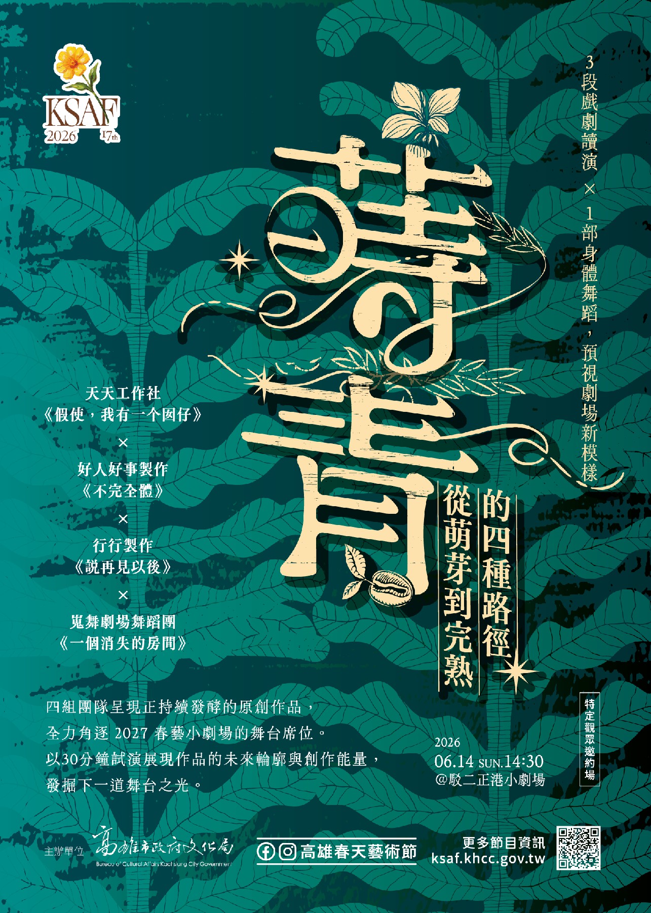 此外,今年特別規劃創作匯演《蒔青:從萌芽到完熟的四種路徑》,集結四組團隊進行階段性呈現,從戲劇讀演到舞蹈展演,展現創作從發想、試驗到成形的歷程。活動亦邀請表演藝術相關科系學生參與觀賞與討論,透過導聆與評論練習,深化觀演經驗,讓劇場成為學習與創作並進的實驗場域。