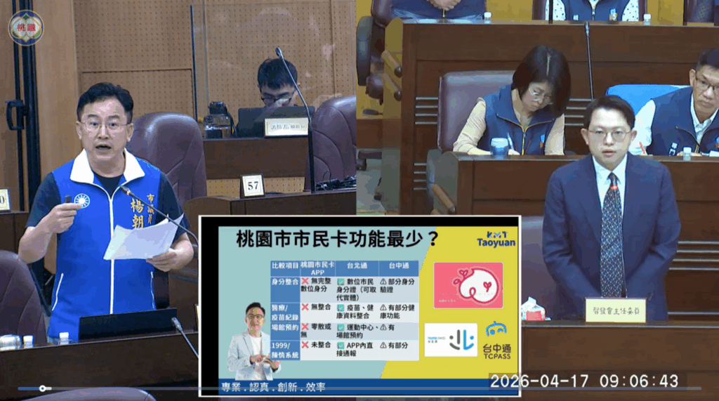 楊朝偉議員表示,對照其他直轄市,「台北通」已整合身分驗證、繳費、申辦、場館預約,甚至醫療與疫苗資訊查詢,「台中通」亦持續擴充市政服務功能;相較之下,桃園市民卡目前仍以卡片功能、停車與點數回饋為主,疫苗紀錄、場館預約等服務分散於不同平台,整體使用體驗明顯落後。