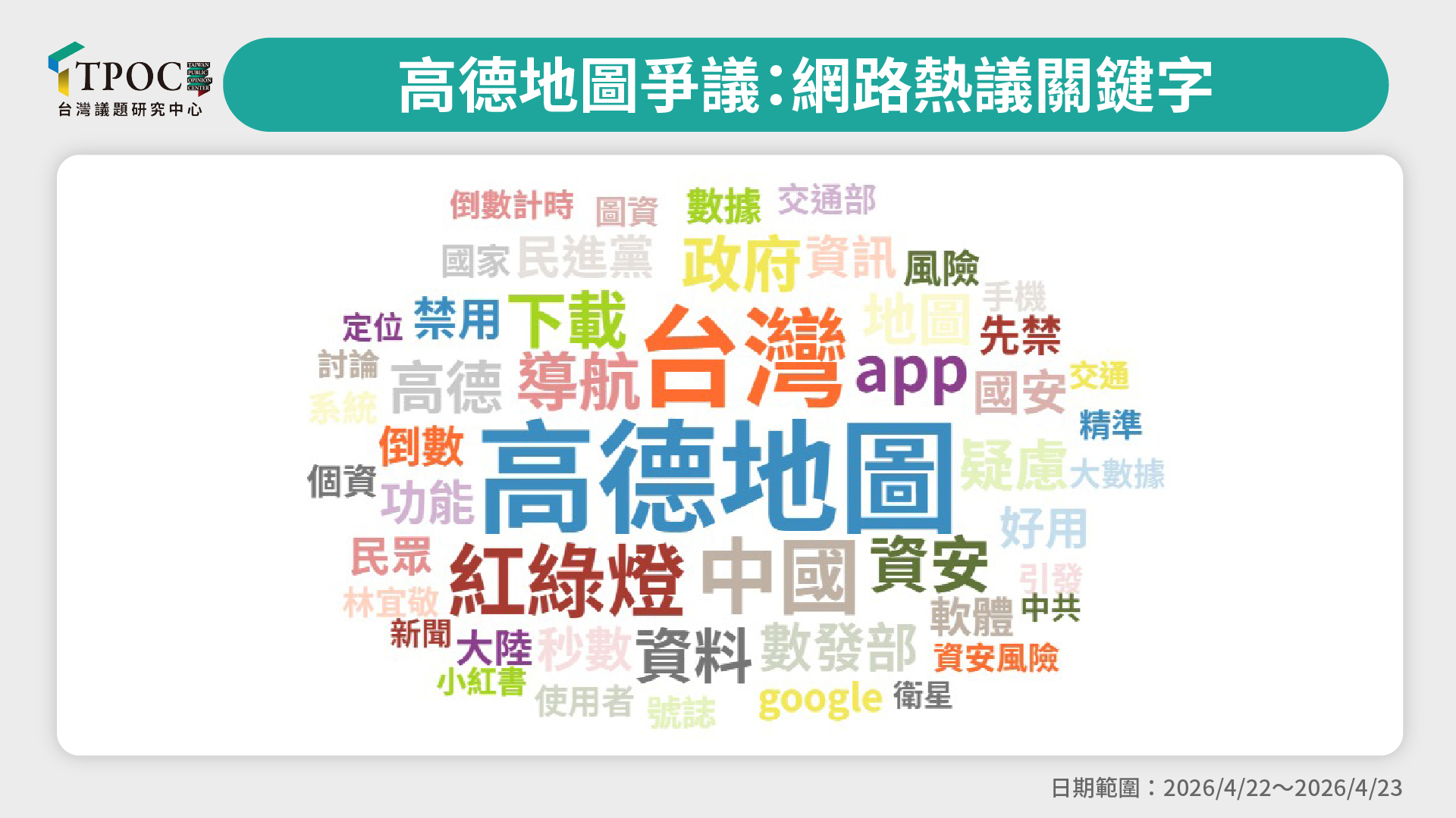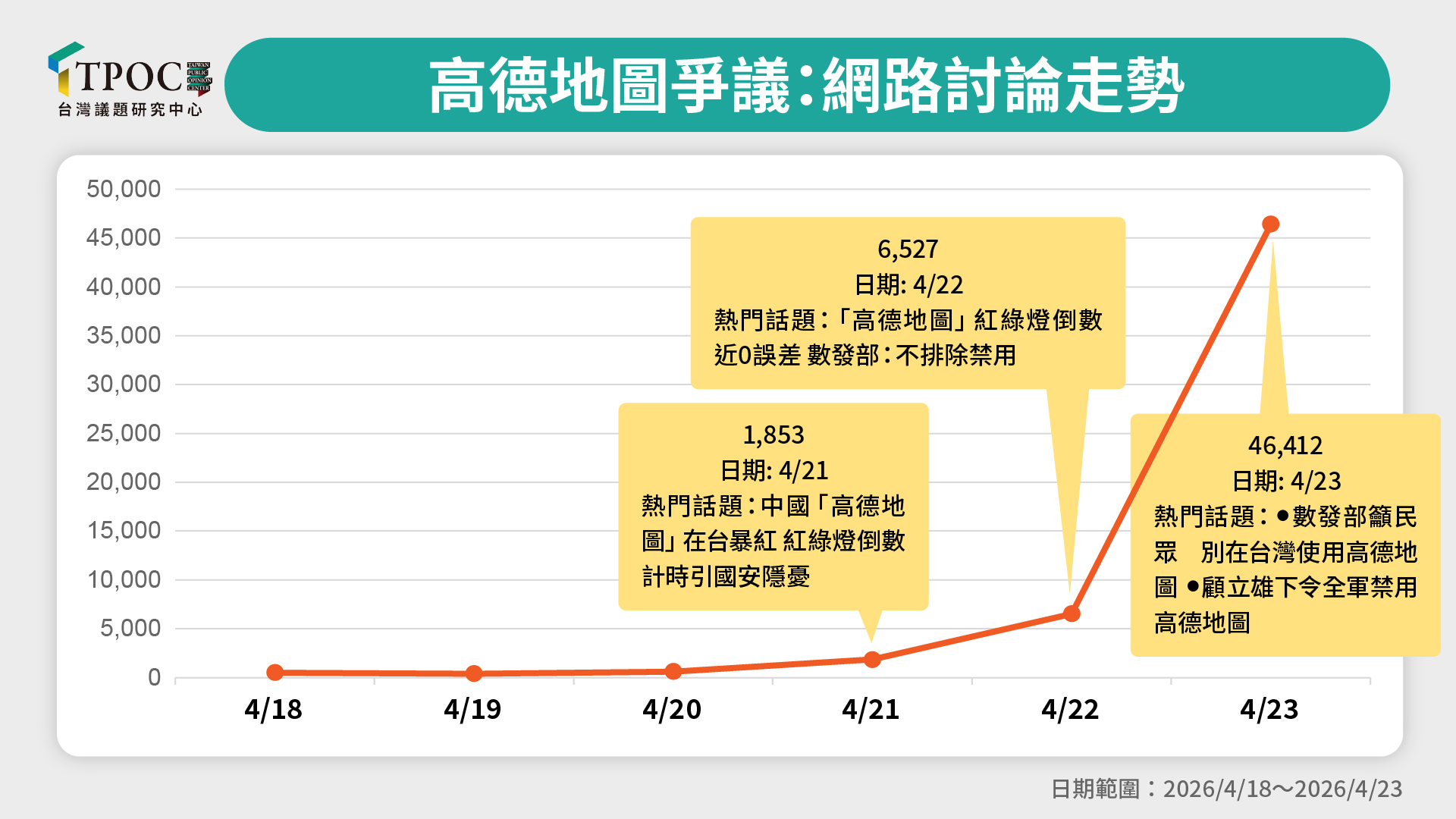 網路聲量數據顯示,高德地圖的討論度於4月18日至23日間呈現爆發性成長,從最初的百則聲量迅速攀升至萬則。事實上,自4月初起,便已有部分使用者在社群分享該軟體在紅綠燈倒數功能上的精準體驗;討論熱度於21日顯著升溫,隨著部分網友在Threads等社群平台發起資安疑慮呼籲,當日聲量已達1,853則。隨著輿情擴散,數位發展部於22日公開回應,說明該功能是基於大數據模型推估,並保留「不排除禁用」的政策彈性,相關回應促使單日聲量翻倍至6,221則。