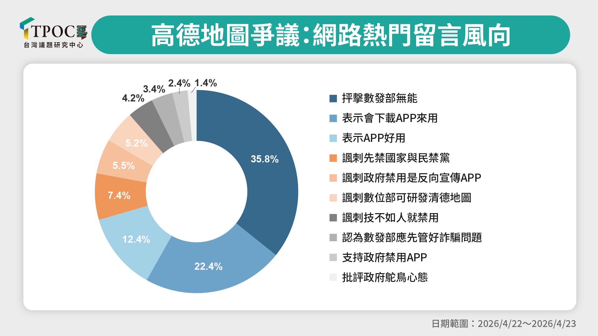 先前「小紅書」被禁,當時TPOC調查指出仍有近四分之一的聲量支持政府立場;然而在本次高德地圖事件中,民眾反應卻呈現截然不同的風向。群眾在稱讚高德地圖「好用」之餘,也同步將輿論矛頭指向執政當局,「先禁國家」等帶有自嘲意味的諷刺聲浪在網路上快速擴散,反映出政府的行政禁用手段,不僅未能回應民眾期待,反而被解讀為一言堂、忽視民間需求的展現,進一步放大群眾反感情緒。隨著高德地圖在iOS與Android免費APP排行榜雙雙衝上第一,網路民意已然以行動表態;若政府後續再打「國安牌」,卻未能提出具說服力的數據或論述支撐,民眾恐難買單。如何調整決策思維並回應社會期待,已成為無可迴避的重要課題。
