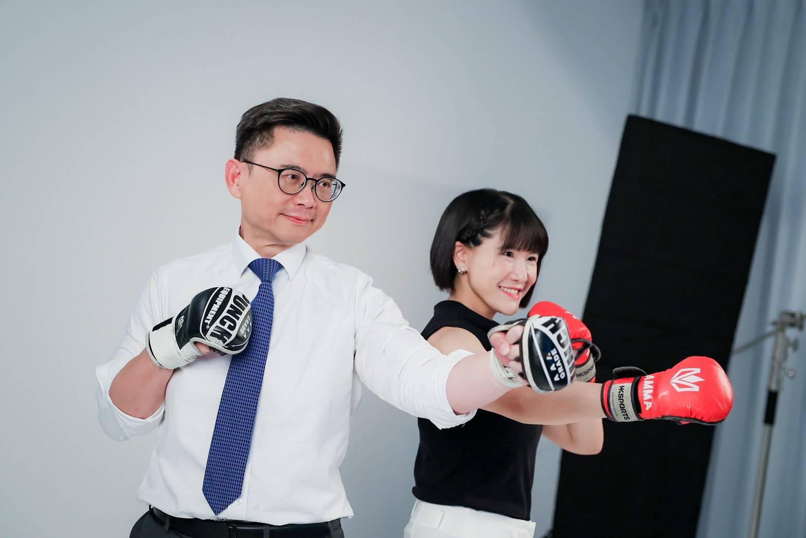 圖說:鄭孟洳(右)與賴瑞隆戴上拳擊手套揮拳。(圖片來源:賴瑞隆服務處提供)