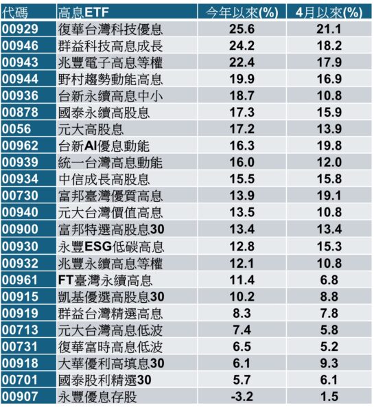 00929今年表現判若兩人,根據理柏統計,截至今年4月24日止,00929 4月以來不到一個月的績效就井噴21.1%,位居所高股息ETF之冠,今年以來績效也以高達25.6%狠甩其他高股息ETF,基金醫生馮志源分析,00929 績效制霸的箇中關鍵,在於「精準換股,重倉佈局 AI 領頭羊」。00929自去年底指數編製規則修訂後,選股邏輯更具動能,換股有如神助,除了不再死守高息科技股外,更成功捕捉 AI 基礎建設與先進封裝的噴發期,隨著 AI 算力需求從雲端延伸至終端,台股半導體供應鏈已居全球核心地位,目前 00929 投資組合中半導體權重高達近五成,而且重倉佈局台積電、聯發科與牧德等 AI 領頭羊,以及受惠先進製程、訂單能見度極高的設備雙雄聖暉與家登,護國神山群布局完整,完美體現了「得半導體者得天下」的產業優勢,展現出強大的「進攻與高股息」雙重特質。