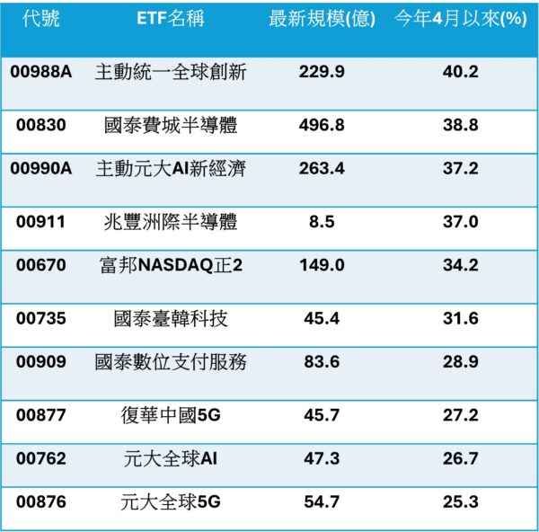 中東衝突雖一度干擾市場情緒,但全球股市已逐步擺脫近一個月陰霾,加上AI投資熱潮不退,帶動股票型ETF表現持續走強。根據CMoney統計,4月以來,海外股ETF績效前十名漲幅均超過25%,且多集中在AI、半導體、5G與數位支付等題材;其中,去年股票型ETF績效王復華中國5G(00877)4月持續上榜,成為前十強中唯一聚焦中國科技股的ETF。